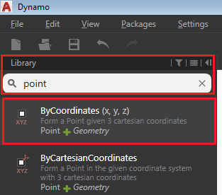 - Wählen Sie aus der Liste der Suchergebnisse die Option ByCoordinates (x, y, z), um einen Punkt mithilfe der Koordinaten x, y, z zu erstellen: