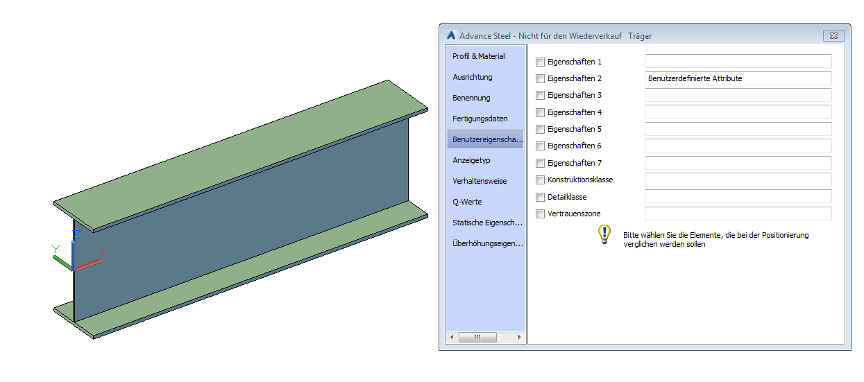 Mit benutzerdefinierten Attributen können Sie in Advance Steel Filter anwenden, um die Elemente auszuwählen und zu verändern: