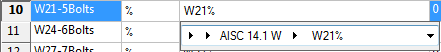 AISC 14.1 W\W21%: Hierdurch wird zusätzliche Filterung zur oben genannten Regel hinzugefügt. Diese gilt weiterhin für sämtliche AISC 14.1 W-Profile, wobei jedoch außerdem nach W21 gefiltert wird. Das bedeutet, dass mit dieser Regel die Verbindung auf W21x68, W21x62, W21x101 usw. angewendet wird.