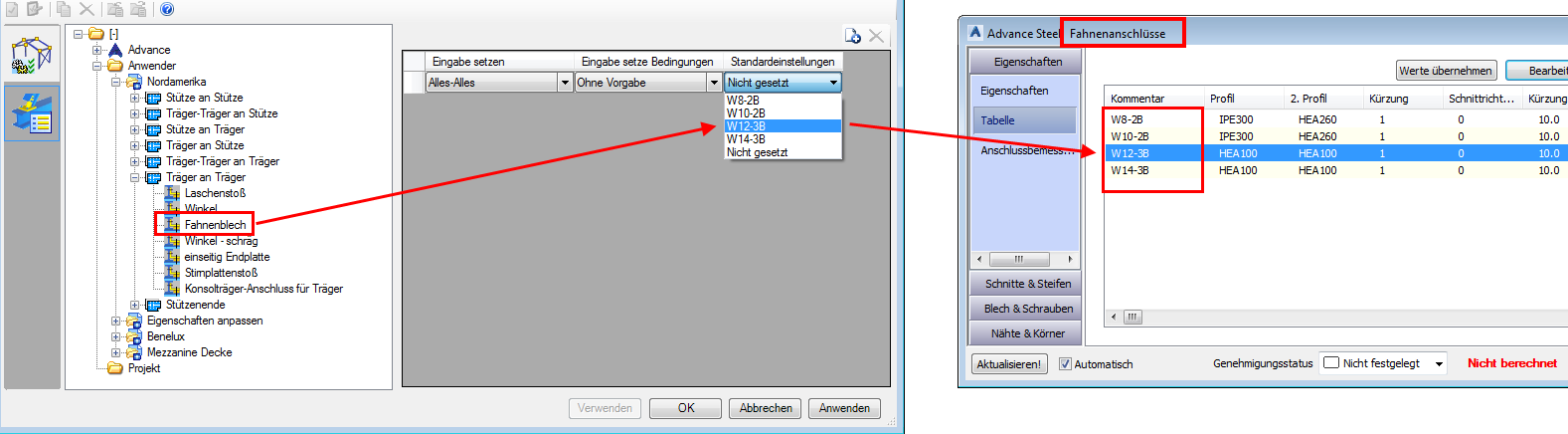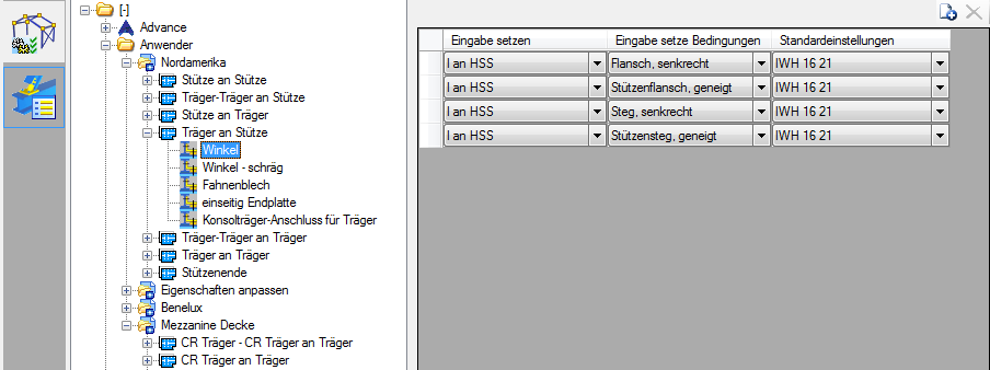 Beispiel: Wenn eine Verbindungsregel mit den Angaben Träger-Träger, I-Träger an I-Träger, Steg von Hauptträger zum Erstellen eines Fahnenblechs erstellt wird, kann in den Vorgabeeinstellungen eine Regel mit denselben Einstellungen Träger-Träger, Fahnenblechanschluss, I-Träger an I-Träger, Steg - Geneigt&Schräg akzeptiert werden. Darüber hinaus können Sie eine zweite Regel für Steg - Senkrecht hinzufügen, die ebenfalls der oben genannten Verbindungsregel entspricht, d. h., für dieselbe Verbindungsregel, die die Erstellung eines Fahnenblechs bei der Verbindung zweier Träger bewirkt, können zwei Zeilen mit Vorgabeeinstellungen zur Verwendung unterschiedlicher Bibliothekseinstellungen für senkrechte einerseits und für geneigte und schräge Anwendungsfälle andererseits konfiguriert werden.
