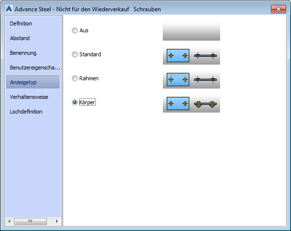 Auf dieser Registerkarte des Dialogfelds Eigenschaften können Sie auswählen, wie Schrauben im Modell angezeigt werden.