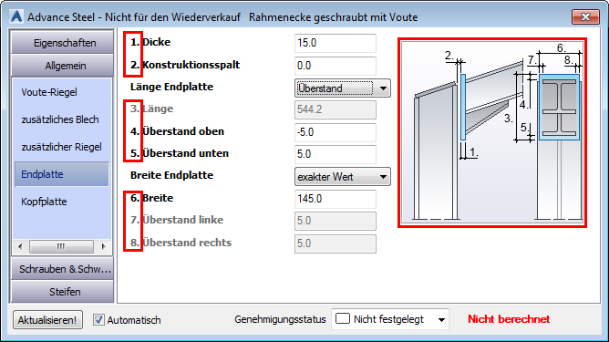 | Schraubengarnitur | Jede Schraubenart besteht aus einer bestimmten Kombination aus Schraube und Mutter (zum Beispiel Standard oder Mutter und zwei Scheiben). Die Dropdown-Liste zeigt die gültigen Optionen an. |
