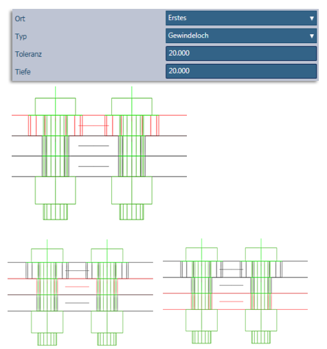Damit können Sie festlegen, auf welchem Element der spezifische konfigurierte Lochtyp erstellt wird, wenn die Schrauben mehrere Elemente durchlaufen. Wenn Sie Erstes/Letztes auswählen, wird der hier festgelegte Lochtyp nur für das erste/letzte Element erstellt, das die Schrauben durchlaufen. Für die restlichen Elemente werden per Vorgabe Rundlöcher erstellt. Wenn Sie Alle auswählen, wird der spezifische konfigurierte Lochtyp auf allen Elementen erstellt. ![]() |
