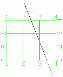 Sie können die Achsen in einer Gruppe verkürzen, indem Sie diese an anderen Objekten schneiden. Diese Objekte können andere Raster sowie AutoCAD®-Objekte (z. B. Linien, Kreise, Polylinien usw.) sein.