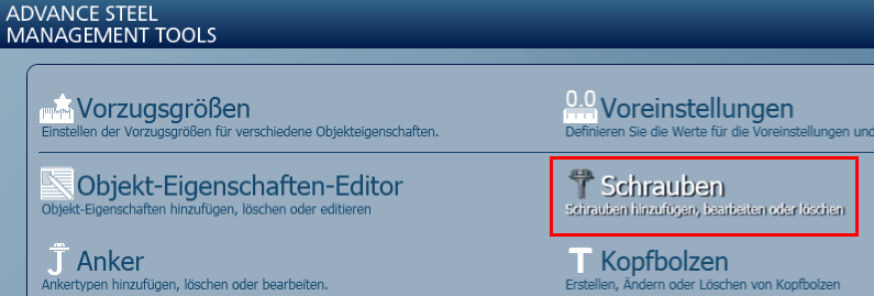 So greifen Sie auf die Anpassungseinstellungen für Schrauben in Advance Steel zu: