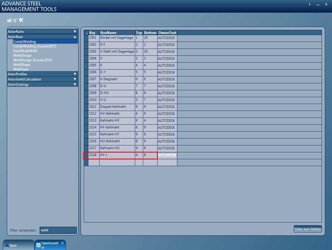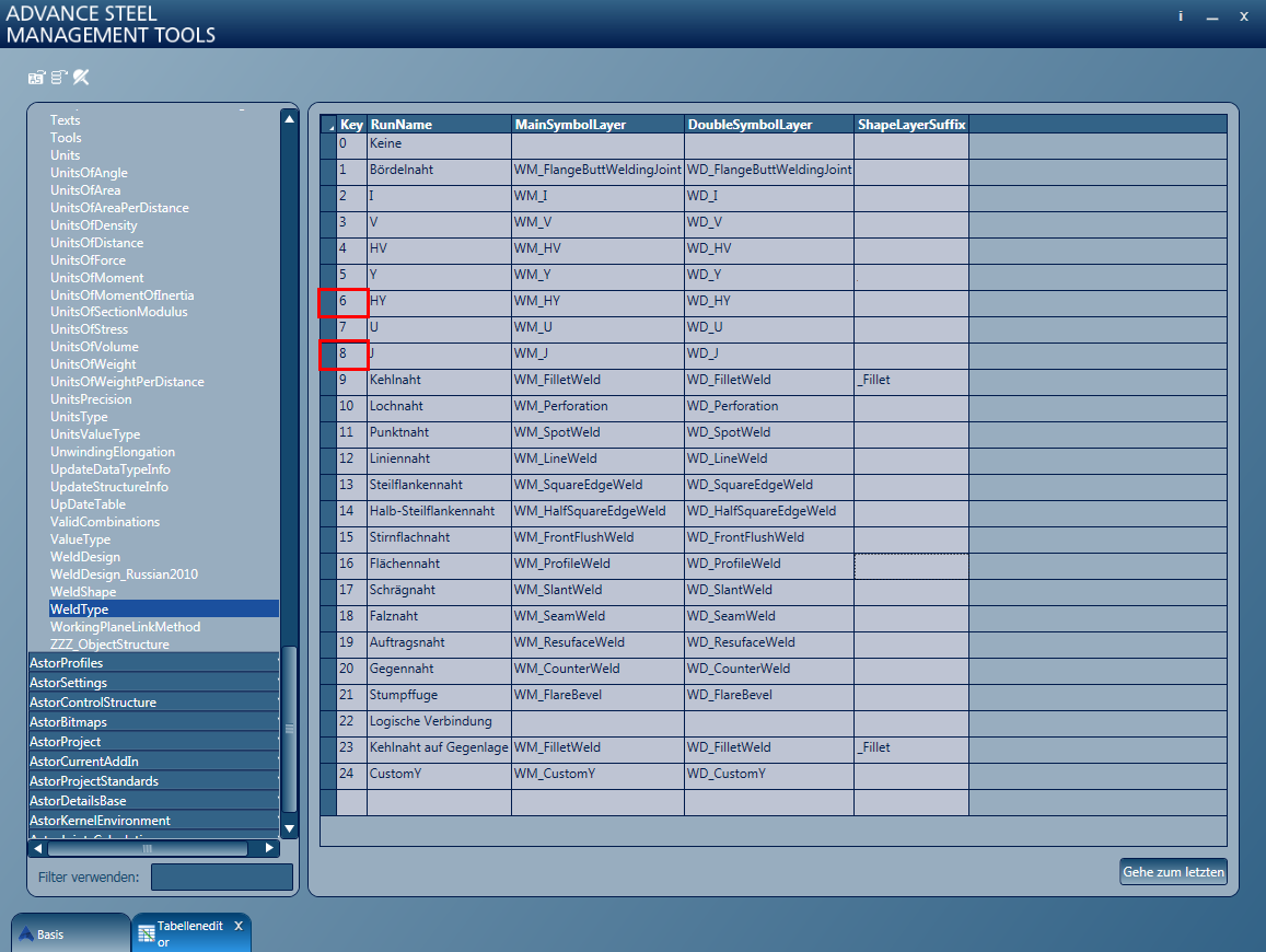 - Öffnen Sie die Tabelle "WeldType" und notieren Sie die mit den gewünschten Schweißsymbolen verknüpften Schlüsselnummern (6 für HY und 8 für J).
