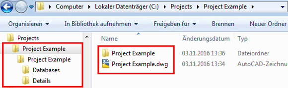 Es wird empfohlen, einen Ordner mit demselben Namen wie die DWG-Datei für das Modell am gewünschten Speicherort auf dem Laufwerk zu erstellen und die Modellzeichnung in diesem Ordner und mit demselben Namen zu speichern. Während das Projekt komplexer wird und abgeleitete Dokumente erstellt werden, erstellt Advance Steel einen Unterordner am Speicherort der DWG-Master-Datei, der den Namen dieser DWG-Datei trägt. In diesem Ordner werden nach Bedarf automatisch weitere Unterordner für Details (Zeichnungen), Stücklisten, Berechnungen, NC-Dateien usw. erstellt.