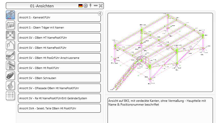 Advance Steel bietet eine Reihe von Zeichnungsstilen für die Erstellung von allgemeinen Übersichtszeichnungen, Profilen und Fertigungsplänen in verschiedenen Konstruktionen.