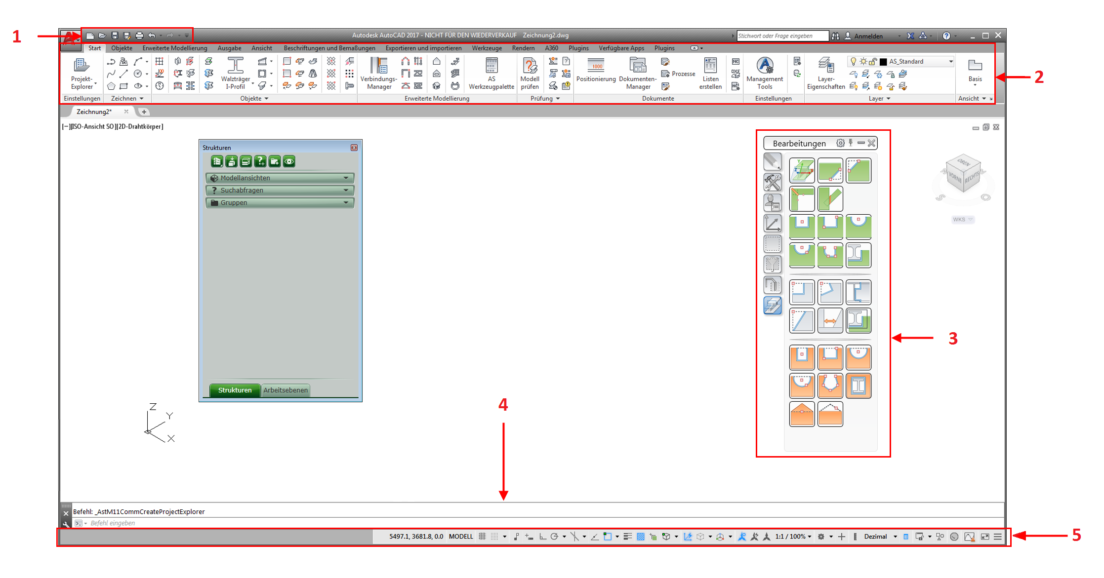 - Zeigt Informationen über den Status in verschiedenen Phasen des Projekts an. Sie bietet außerdem Zugriff auf die Konfiguration bestimmter Parameter: Fangmodi, QuickInfos für Objekte, aktuelles Koordinatensystem und Arbeitseinheiten.