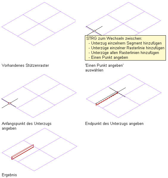 | Hinzufügen eines Unterzugs entlang einem oder mehreren Segmenten eines Stützenrasters | Zeigen Sie mit dem Cursor auf ein Segment im Raster, um eine Vorschau des Unterzugs anzuzeigen, und klicken Sie, um den Unterzug zum Segment hinzuzufügen, oder drücken Sie die STRG-Taste, und klicken Sie, um Unterzüge entlang allen Segmenten der Rasterlinie hinzuzufügen, oder drücken Sie zweimal die STRG-Taste, und klicken Sie, um Unterzüge entlang allen Segmenten des Rasters hinzuzufügen. Drücken Sie die EINGABETASTE, um den Befehl zu beenden. |