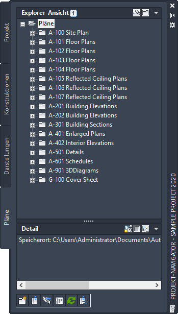 Die grundlegenden Kategorien werden im Zeichnungs-Explorer durch Ordner innerhalb der Projektstruktur dargestellt, die Ihnen helfen, Ihre Projektdateien nach Bereichen, Zeichnungstypen oder Aspekten Ihres Arbeitsablaufs anzuordnen.