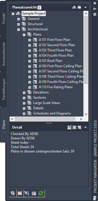 In der Explorer-Ansicht werden die Planzeichnungen in Ordnerkategorien gruppiert. Wenn Sie in einer Planzeichnung Pläne oder Planansichten erstellen, werden diese in der Planzeichnung platziert.