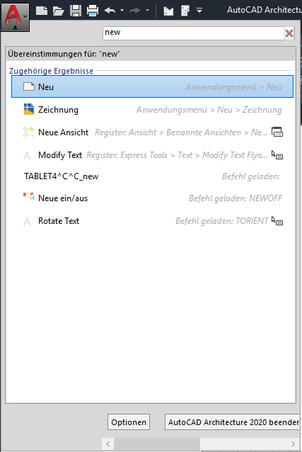 Im Menü-Browser können Sie nach einem Befehl suchen und ihn in der Ergebnisliste auswählen. Die Ergebnisse wurden an folgenden Orten gesucht: