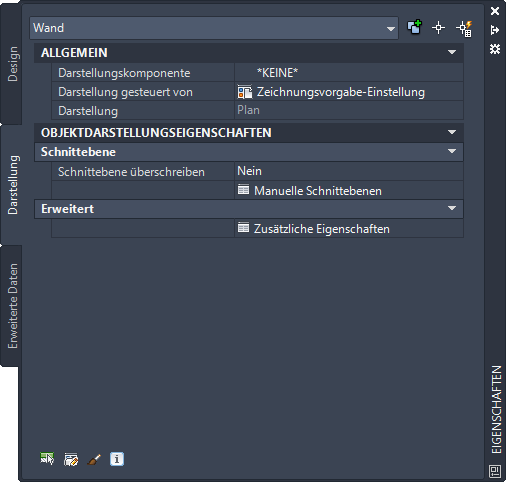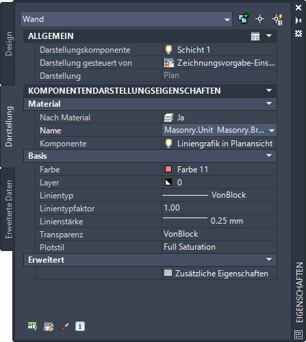Sie können die Registerkarte Darstellung der Eigenschaftenpalette verwenden, um die Einstellungen der Darstellungseigenschaften für ein ausgewähltes Objekt in der aktuellen Darstellung zu ändern. Sie können Einstellungen für Eigenschaften ändern, die das gesamte Objekt betreffen (wie die Schnittebenenhöhe), sowie Einstellungen für die einzelnen Darstellungskomponenten des Objekts (wie Farbe, Layer und Linientyp für eine Schraffurkomponente).