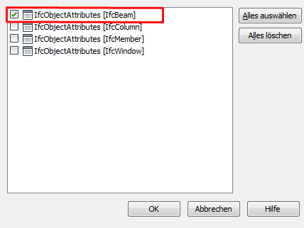 Sie können nun bestimmte IFC-Attribute für IfcBeam mithilfe des Eigenschaftssatzes IfcObjectAttributes [IfcBeam] zuweisen.