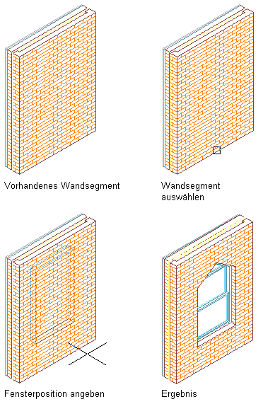 | ein Fenster in eine Wand | Wählen Sie die Wand, und geben Sie einen Einfügepunkt entlang der Wand an. |