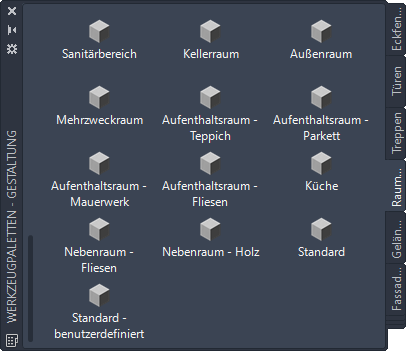 Die Werkzeugpalette Raumbuch enthält die verschiedenen Oberflächematerialstile. Die Befehle sind mit der Datei