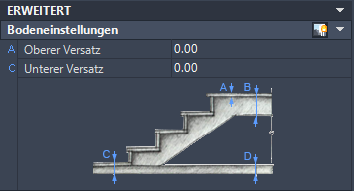 Anmerkung: Die Einstellungen für Tiefe (oben, unten) haben gegenwärtig keinen Einfluss auf Stufen und Wangen. Die Einstellung für den oberen Versatz hat keinen sichtbaren Einfluss auf die Stufe. Der untere Versatz verlängert bzw. verkürzt möglicherweise beigefügte Wangen. Beide Versatzwerte beeinflussen die Höhe von Boden zu Boden, falls diese angezeigt wird.