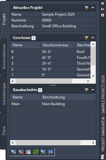 Die Projekt-Navigator-Palette ist der zentrale Ort zum Erstellen, Öffnen und Ändern von AutoCAD Architecture toolset-Projektdateien. Normalerweise ist die Projekt-Navigator-Palette im Arbeitsbereich während der Projektarbeit geöffnet.