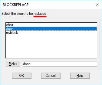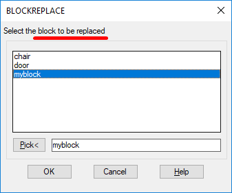 Geben Sie den Namen des zu suchenden Blocks an, indem Sie ihn in der Liste auswählen oder indem Sie auf die Schaltfläche Auswählen klicken und einen Block in der Zeichnung auswählen: