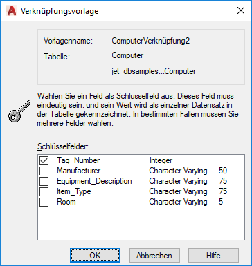Zeigt alle Felder an, die für die aktuelle Datenbanktabelle zur Verfügung stehen, außerdem den Feldtyp sowie (bei alphanumerischen Feldern) die Feldlänge. Um ein Schlüsselfeld für die Verknüpfungsvorlage festzulegen, aktivieren Sie das Kontrollkästchen links neben dem gewünschten Feldnamen.