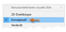 Klicken Sie in den Steuerelementen des Ansichtsfensters auf [2D-Drahtkörper], und wählen Sie im Menü die Option Konzeptuell.