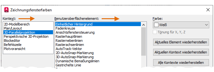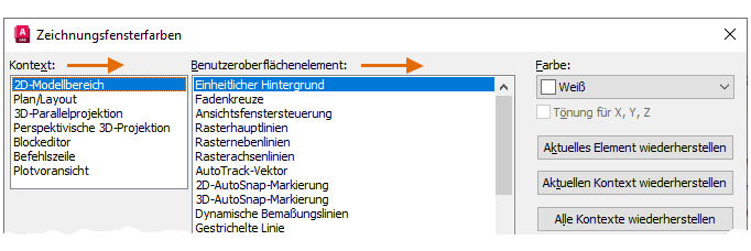 Anmerkung: Um schnell zu den vorgegebenen Farbeinstellungen zurückzukehren, öffnen Sie das Dialogfeld Zeichnungsfensterfarben und klicken auf Alle Kontexte wiederherstellen auf der rechten Seite des Dialogfelds Zeichnungsfensterfarben.