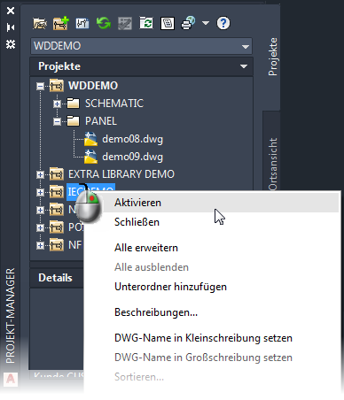 Sie können im Projekt-Manager beliebig viele Projekte geöffnet haben, es kann jedoch jeweils nur ein Projekt aktiv sein. Durch projektweite Funktionen werden nur die Zeichnungen des aktiven Projekts verarbeitet.