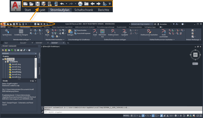 Über die Multifunktionsleiste haben Sie Zugriff auf alle in diesem Handbuch beschriebenen Funktionen. Darüber hinaus enthält der abgebildete Schnellzugriff-Werkzeugkasten spezifische Navigationsbefehle für AutoCAD Electrical toolset.