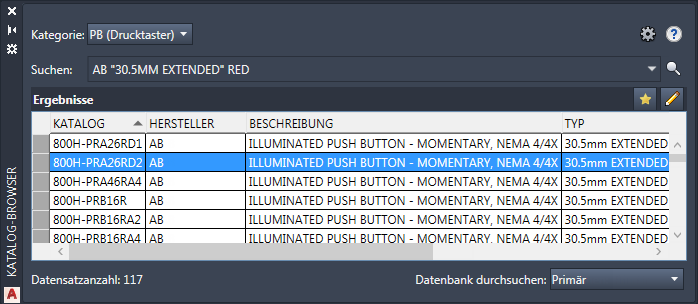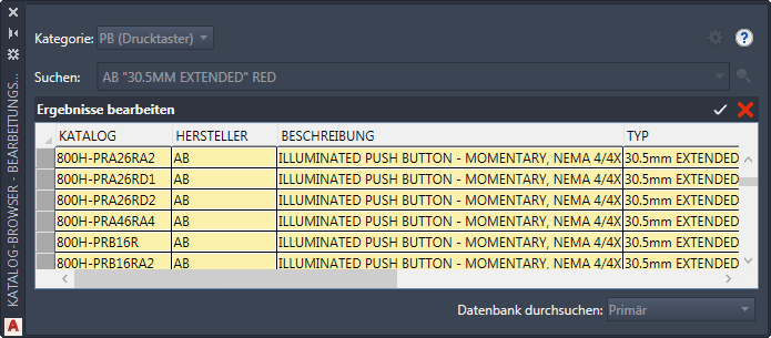 Anmerkung: Unterbaugruppenelemente, wie durch einen Wert für BAUGRUPPENLISTE definiert, werden nicht in die Suchergebnisse aufgenommen. Verwenden Sie den Bearbeitungsmodus des Katalog-Browsers zum Anzeigen und Bearbeiten von Unterbaugruppenelementen.