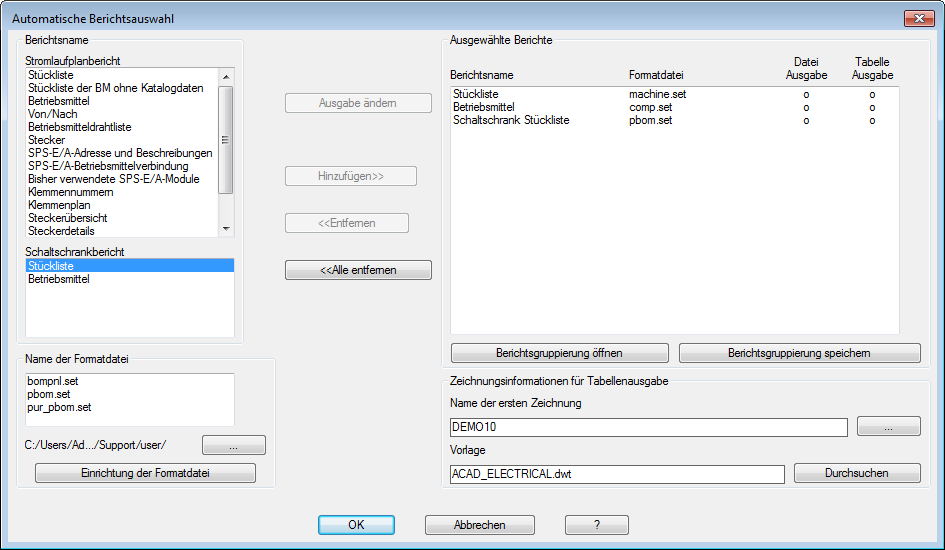 Wählen Sie den Berichtsnamen und Formatdatei (.set) für jeden Bericht, den Sie ausführen möchten. Die Formatdateien sollten entweder die Dateiausgabe, die Tabellenausgabe oder beides definieren.