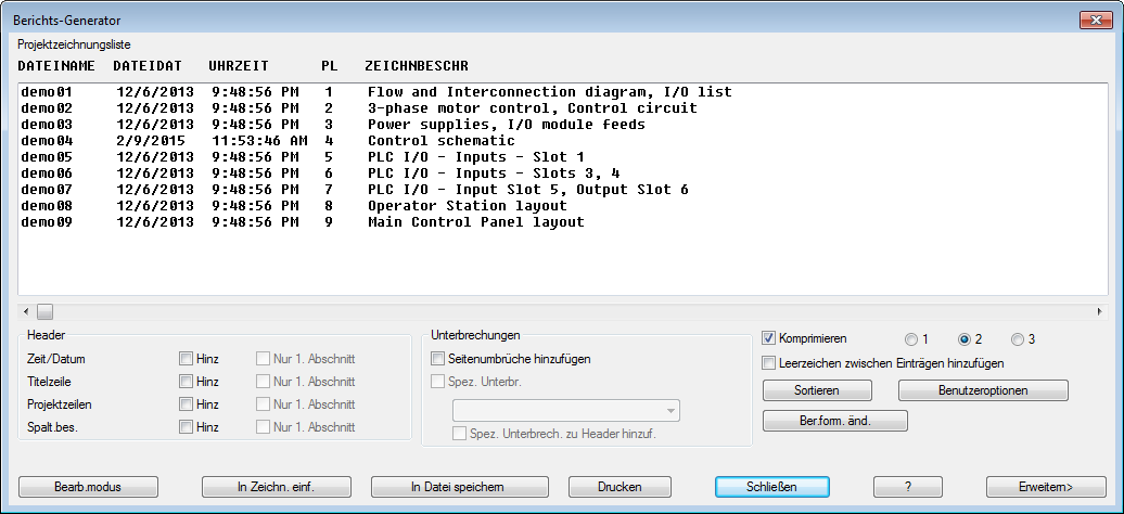 Extrahiert die Einstellungen jeder Zeichnung im Projekt und zeigt sie in einem Bericht an.
