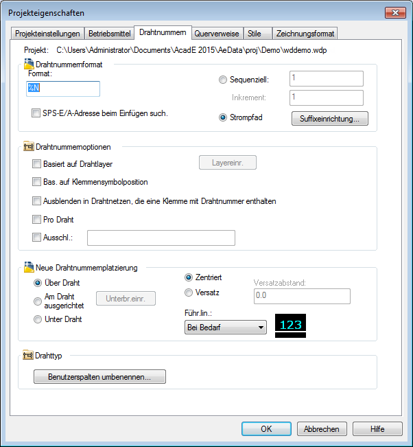 - Definieren der Drahtnummernplatzierung: oberhalb, unterhalb oder am Draht ausgerichtet.