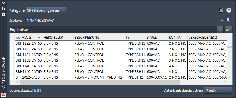 Beispiel: Sie möchten, dass der Katalog-Browser, wenn Sie bei einer Relaisspule ohne Katalogwert auf Suchen klicken, nach Siemens-Teilenummern für 600VAC-Relais sucht. Bearbeiten Sie die Katalogdatenbankdatei, und wählen Sie die Tabelle _LISTBOX_DEF aus. Fügen Sie einen Datensatz mit folgenden Feldwerten ein: