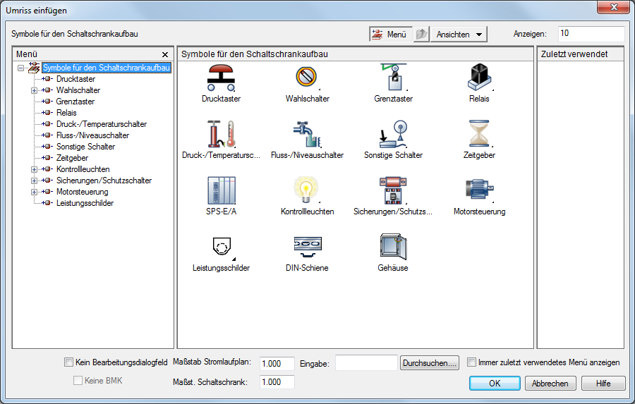 Für Schaltschrank-Betriebsmittel, die nicht im Stromlaufplan dargestellt werden, verwenden Sie das Schaltschrank-Symbolmenü, um Schaltschrank-Grundrisse einzufügen. Finden