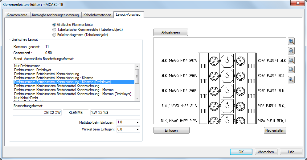 Verwenden Sie die Registerkarte Layout-Vorschau zum Einfügen der Klemmenleiste. Wählen Sie hierzu den Typ und den Beschriftungsstil aus. Mithilfe der Vorschau können Sie sicherstellen, dass alles wie gewünscht eingerichtet ist.