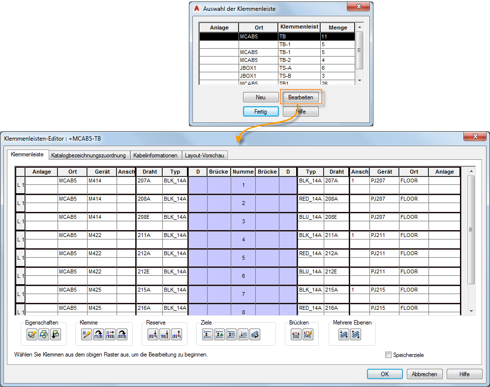 Der Editor enthält Informationen über Katalogwerte, verbundene Betriebsmittel, verbundene Drähte, Drahtnummern und vieles mehr.