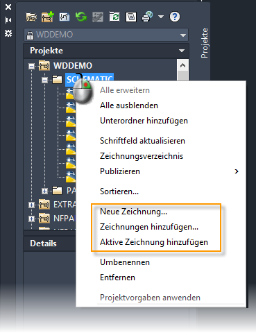 Fügen Sie dem aktiven Projekt jederzeit vorhandene Zeichnungen hinzu. Dies machen Sie zum Beispiel, wenn Sie Zeichnungen eines früheren Projekts wiederverwenden möchten. Zum Hinzufügen oder Erstellen von Zeichnungen in einem bestimmten Ordner klicken Sie mit der rechten Maustaste auf den Ordnernamen im Projekt-Manager und wählen die Zeichnungsoption aus.