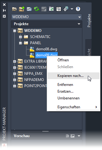 Verwenden Sie den Projekt-Manager, um eine einzelne Zeichnung aus einem beliebigen geöffneten Projekt zu kopieren und zum aktiven Projekt hinzuzufügen.