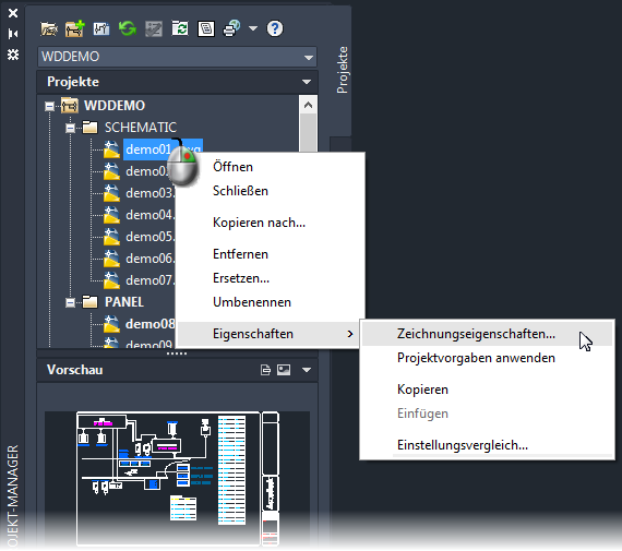 Die Zeichnungseigenschaften können aus den für das Projekt festgelegten Zeichnungsvorgaben übernommen werden. Mit dem erst später beschriebenen Befehl Projektweite Neuanordnung/Neuberechnung sind Aufgaben wie die Aktualisierung von Stromlaufplänen, die Neuberechnung von Betriebsmittel-Kennzeichnungen und Drahtnummern oder die Aktualisierung von Querverweisen sehr schnell durchgeführt.