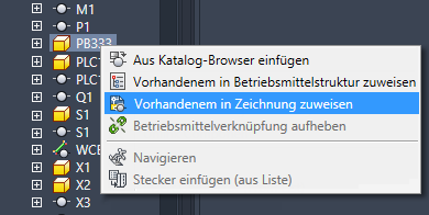 Wählen Sie in der aktiven Zeichnung das elektrische Betriebsmittel aus, das mit dem Inventor-Bauteil verknüpft werden soll. Die Betriebsmittel-Strukturansicht wird aktualisiert, um das verknüpfte Betriebsmittel anzuzeigen.