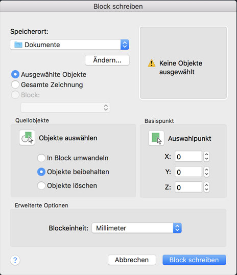 Im Dialogfeld Block schreiben werden unterschiedliche Vorgabeeinstellungen angezeigt, je nachdem, ob nichts, ein einzelner Block oder andere Objekte ausgewählt sind.