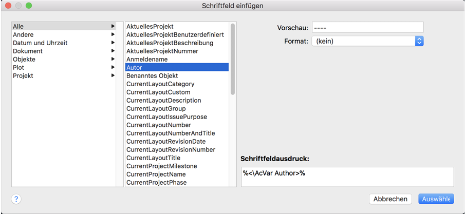 Zeigt den Ausdruck an, der dem Schriftfeld zugrunde liegt. Der Schriftfeldausdruck kann zwar nicht bearbeitet werden, dieser Bereich gibt jedoch Aufschluss darüber, wie Schriftfelder aufgebaut sind.
