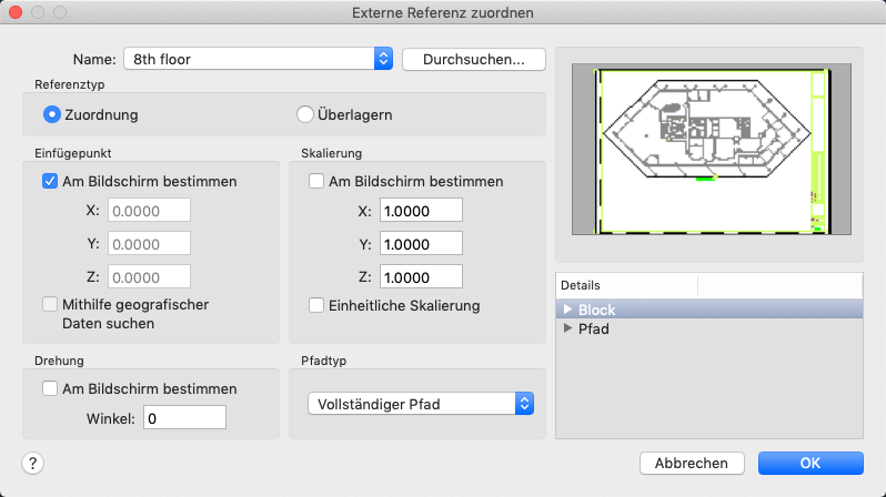 Zeigt Informationen über den Block un den Dateipfad der zugeordneten externen Referenzen an.