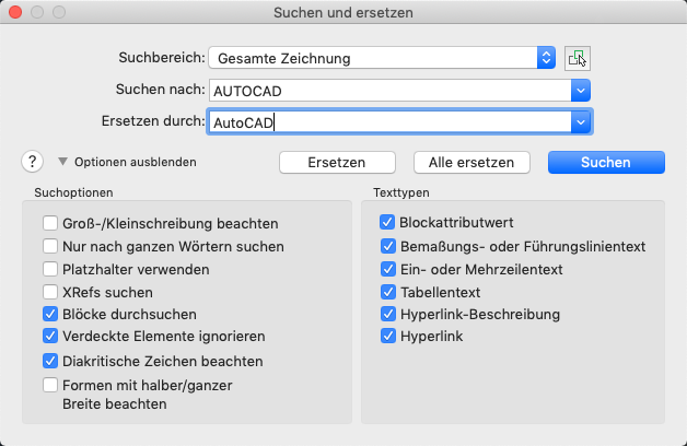 Ermittelt alle Textstellen, an denen der Text im Feld Suchen nach gefunden wird, und ersetzt diese Fundstellen durch den Text im Feld Ersetzen durch.