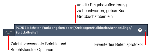 Nachdem Sie einen Befehl eingegeben haben, wird in der Befehlszeile ggf. eine Reihe von Eingabeaufforderungen angezeigt. Nachdem Sie z. B. PLINIE eingeben und dann die erste Eingabeaufforderung festlegen, wird die folgende Eingabeaufforderung angezeigt: