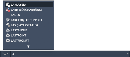 Für einige Befehle gibt es abgekürzte Namen oder Befehlsaliasse, die Sie in der Befehlszeile eingeben können. Beispiel: Statt kreis zum Starten des Befehls KREIS einzugeben, geben Sie nur k ein und drücken die EINGABETASTE. Der Befehl Vorschlag (falls verfügbar) zeigt die Aliasnamen vor dem Befehlsnamen an: C (KREIS)