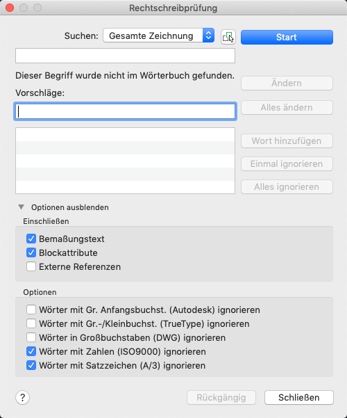 In Blockattributen werden nur die Attributwerte überprüft. In Textobjekten wird die Rechtschreibprüfung in Blockreferenzen und verschachtelten Blockreferenzen durchgeführt, in Blockdefinitionen dagegen nur, wenn die verbundene Blockreferenz ausgewählt wurde.