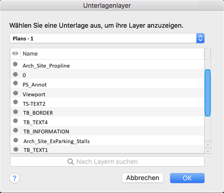 Zeigt die Namen aller verfügbaren Layer in der ausgewählten Unterlage an