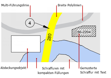 Sie können überlappende Objekte steuern, die einen Bereich bedecken, z. B. Objekte mit dicken Linienstärken, breite Polylinien, Schraffuren und Füllungen, Beschriftung und Bilder. Beispiel: Die folgende Karte enthält verschiedene Arten von überlappenden Objekten. Die Reihenfolge, in der diese Objekte angezeigt und geplottet werden, ist offensichtlich wichtig.